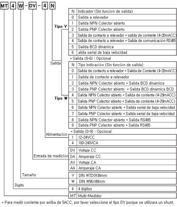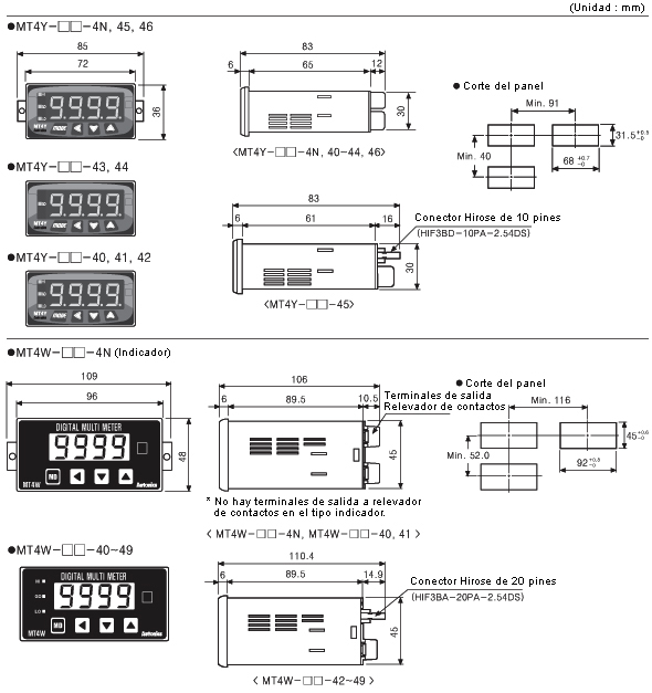 Los medidores para panel digitales Serie MT4Y/MT4W son una versión del medidor para panel con varias funciones, incluyendo monitoreo del valor max. y min., retraso del ciclo de muestreo, ajuste cero, corrección del valor alto del display y función de escala de salida de corriente, etc. Además, se encuentra disponible el voltaje 12-24VCC para la Serie MT4W.